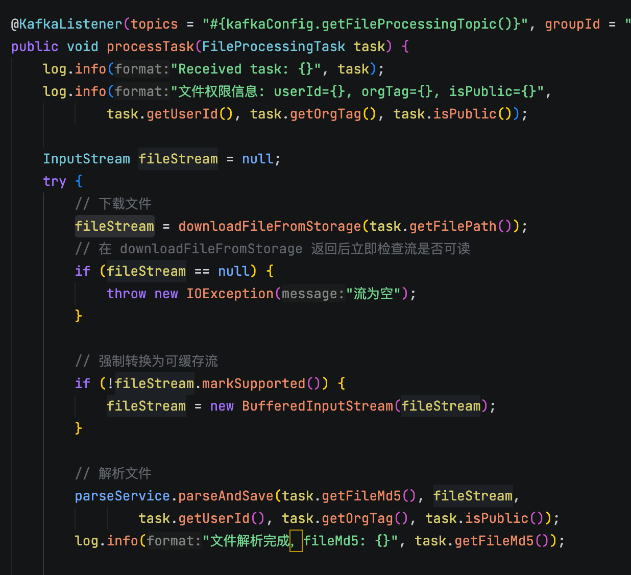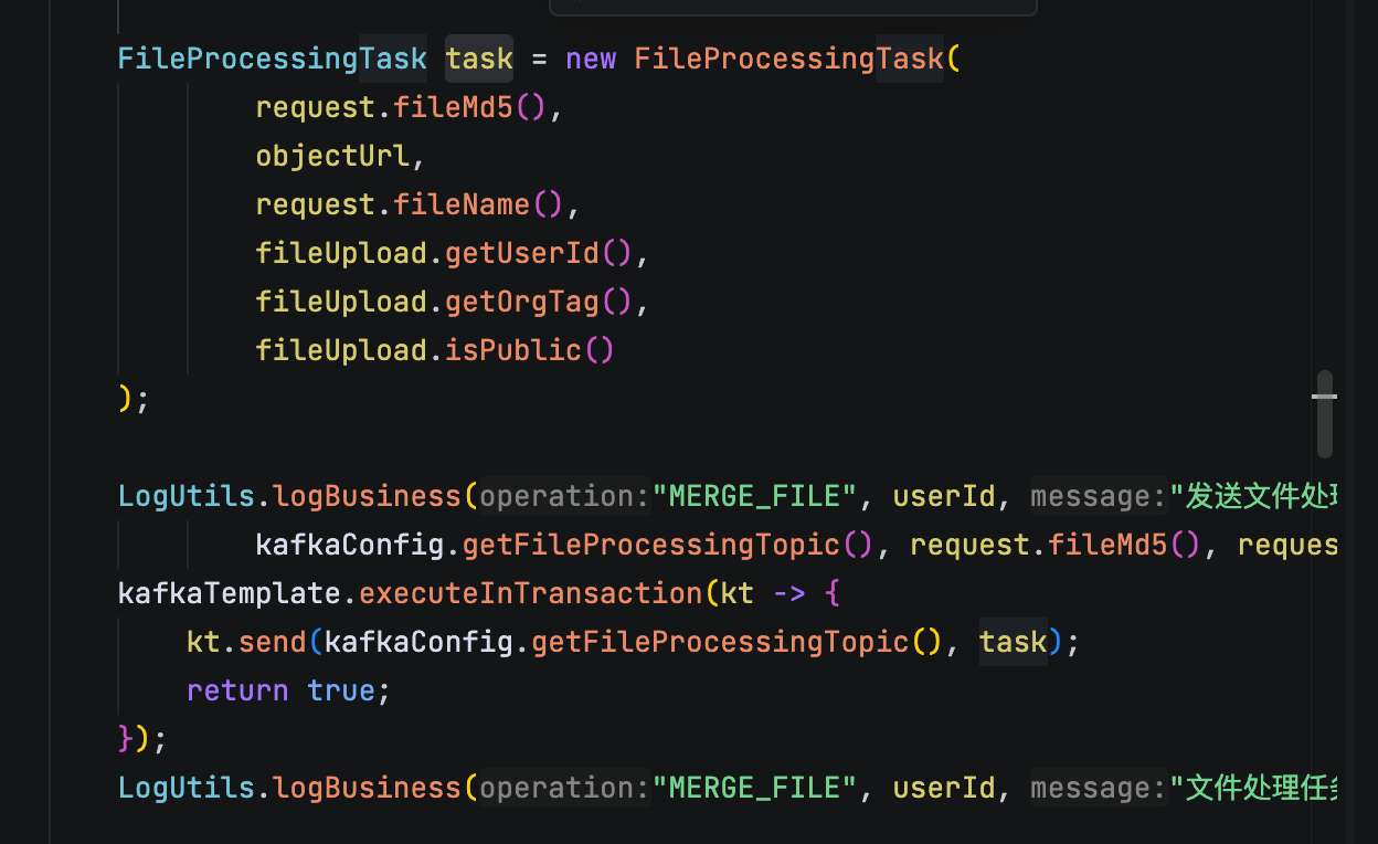 整个流程从用户上传文档开始。用户通过前端界面选择文档并设置相关的组织标签和可见性权限后,系统开始接收文档。这个阶段的关键是建立文档的基本信息记录,包括文件的 MD5 哈希值、原始文件名、文件大小、上传用户信息等。系统会为每个文档生成唯一的标识符,并将文档的元数据信息存储到 MySQL 数据库中,同时将原始文件保存到文件存储系统中。
